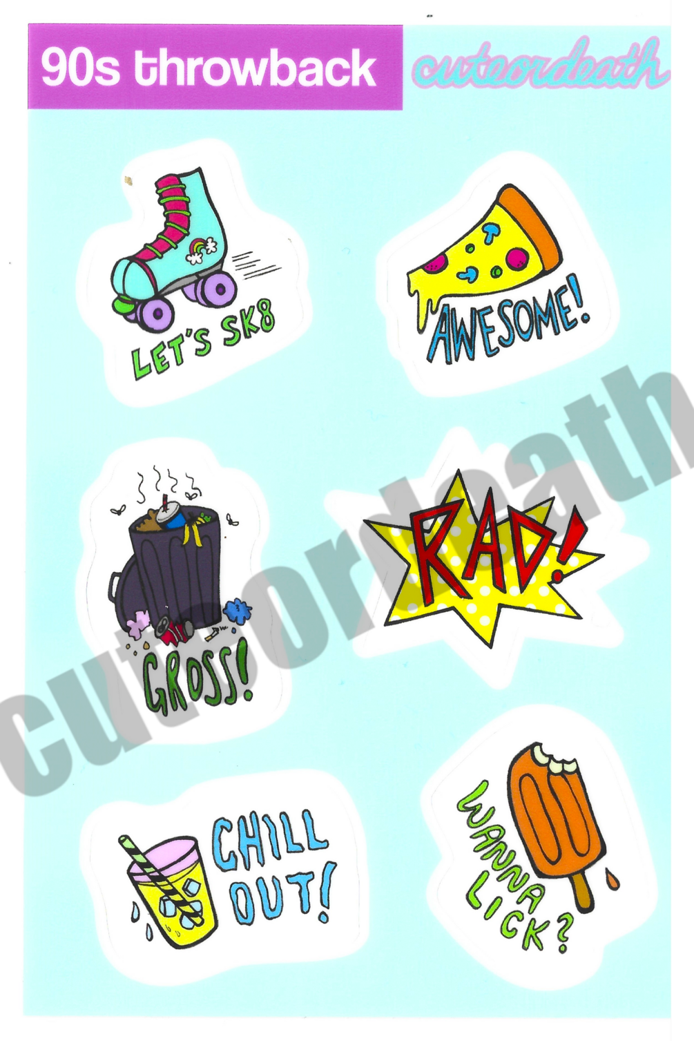 Vinyl professionally printed sticker sheet featuring hand drawn illustrations inspired by 90s sticker styles. Contains 6 stickers that are about 1-1.25 inches each. Sheet is 4x6 inches. Watermark does not appear on actual item.